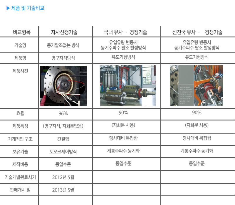 · 당사의 발전기 토크제어기술은 직접 토크제어 인버터를 사용하여 터빈에서 출력되는 힘과 발전기가 가지는 힘의 균형을 유지하는