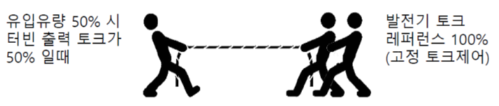※ 유량변동 시 발전기의 토크가 100%로 유지되면 터빈의 회전하는 힘은 낮아지고