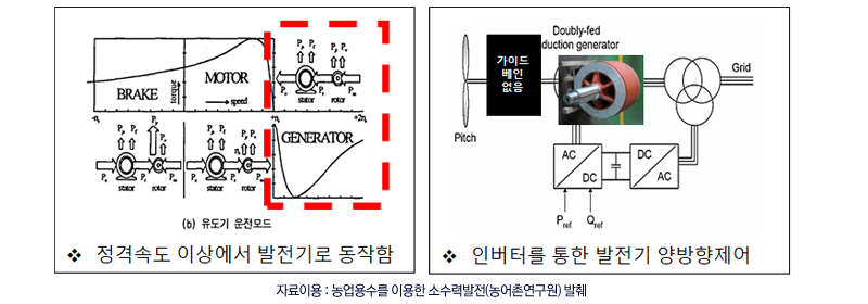 · 기존의 기술방식은 계통접속을 위하여 발전기가 정격속도 이상을 유지해야만 발전이 가능함.